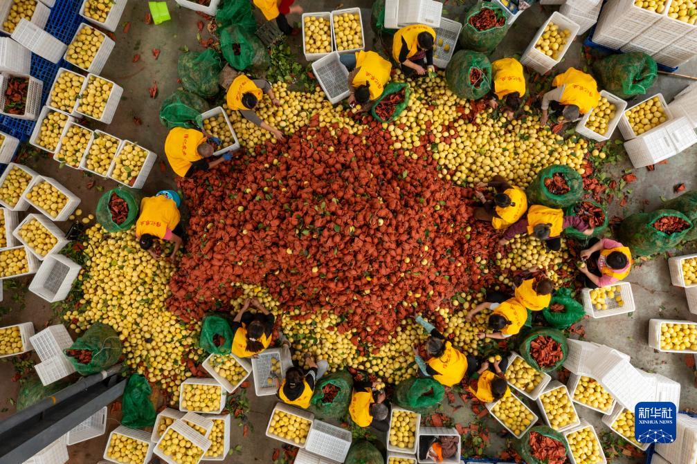 10月31日,在位于四川資陽(yáng)市安岳縣的四川省維記農業(yè)集團有限公司,工人初步挑選新鮮檸檬(無(wú)人機照片)。