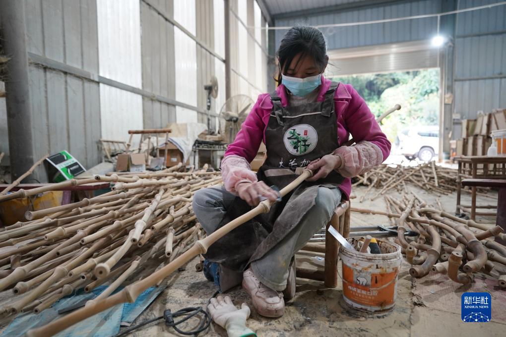 10月31日,昭通市大關(guān)縣一家筇竹家具企業(yè)員工在打磨竹仗。