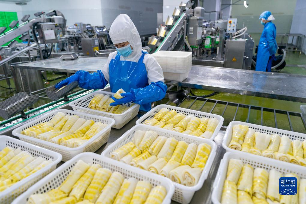 10月31日,昭通市大關(guān)縣一家竹筍生產(chǎn)企業(yè)員工在流水線(xiàn)上投放竹筍。