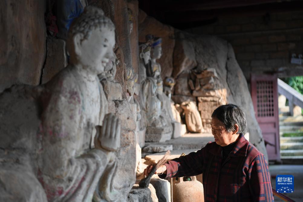 10月31日,在重慶市大足區中敖鎮金盆村,義務(wù)文保員在普圣廟摩崖造像文物保護點(diǎn)打掃衛生。