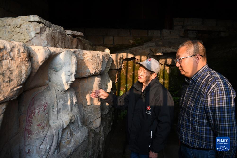 10月31日,在重慶市大足區中敖鎮金盆村,義務(wù)文保員(左)在向大足石刻研究院工作人員介紹普圣廟摩崖造像保護情況。