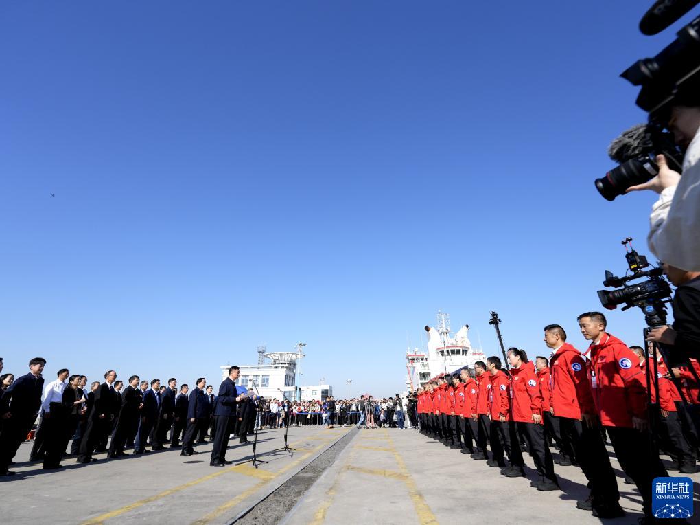 11月1日在中國極地考察國內基地碼頭拍攝的中國第40次南極科學(xué)考察隊出征儀式。