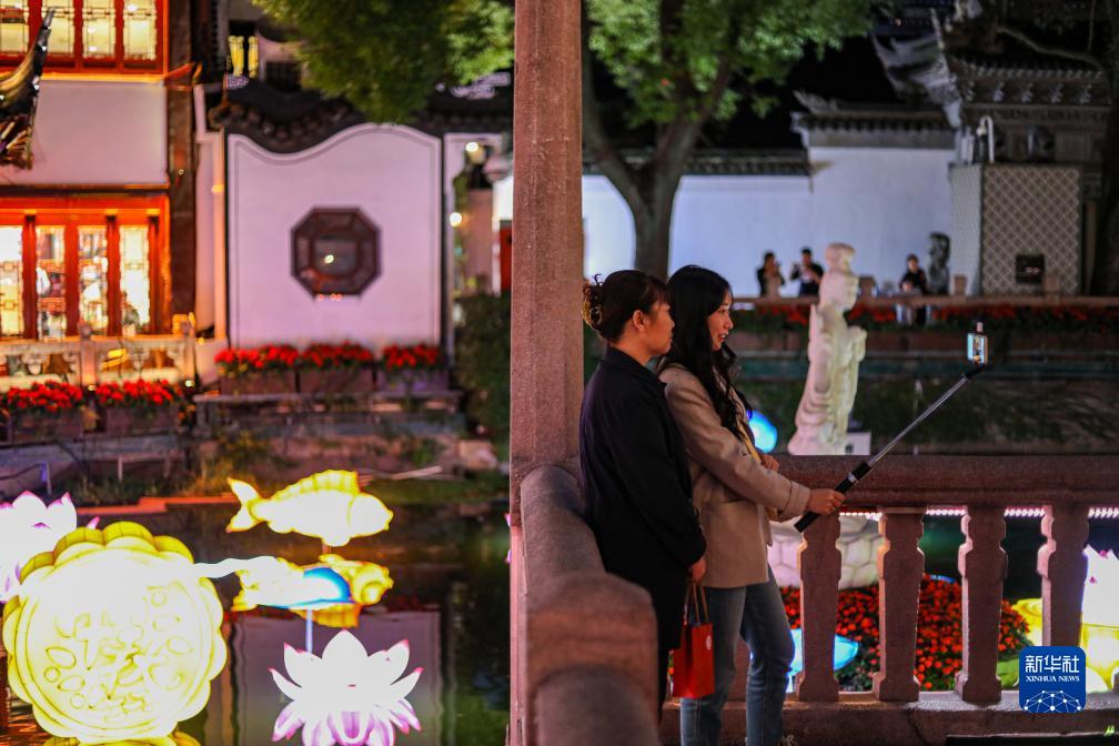 10月11日,游客在上海豫園的湖心亭拍照留念。