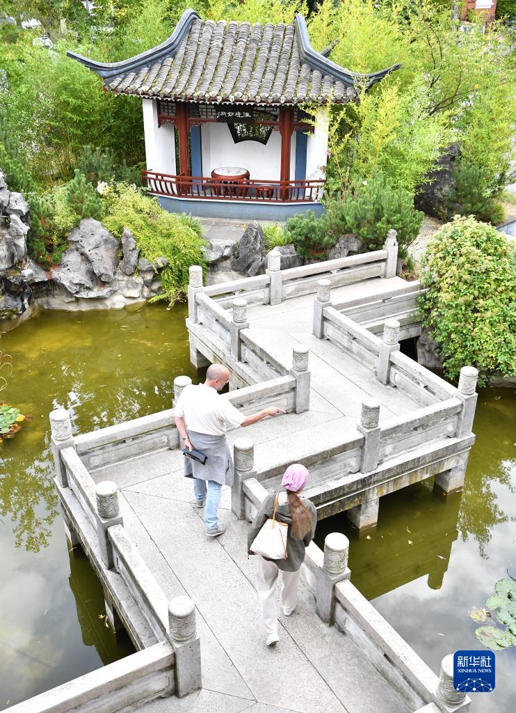 9月29日,人們行走在德國漢堡豫園九曲橋上。