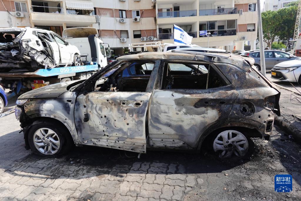 這是11月1日在以色列南部城市阿什杜德拍攝的遭火箭彈襲擊后損毀的車(chē)輛。