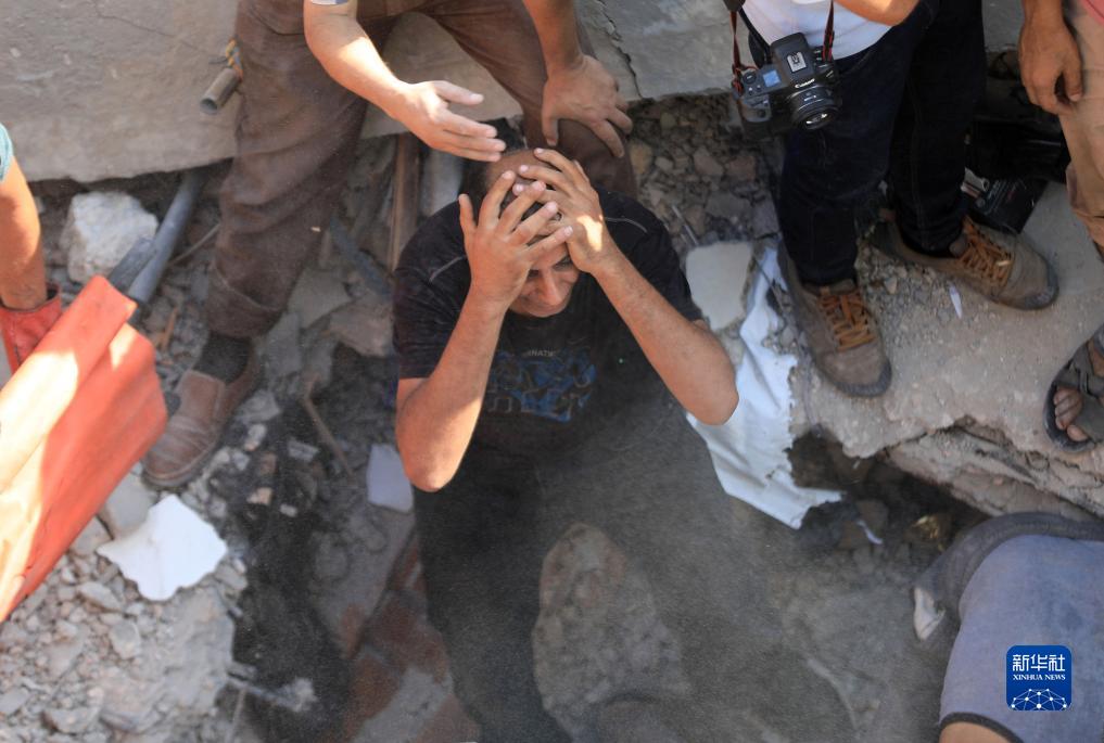 11月1日,在加沙地帶南部城市汗尤尼斯,一名男子在遭以色列襲擊后的建筑廢墟中情緒激動(dòng)。
