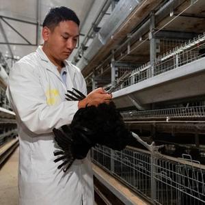 11月1日,一名工作人員在鹽津縣一家種雞場(chǎng)檢查烏骨雞生長(cháng)情況。