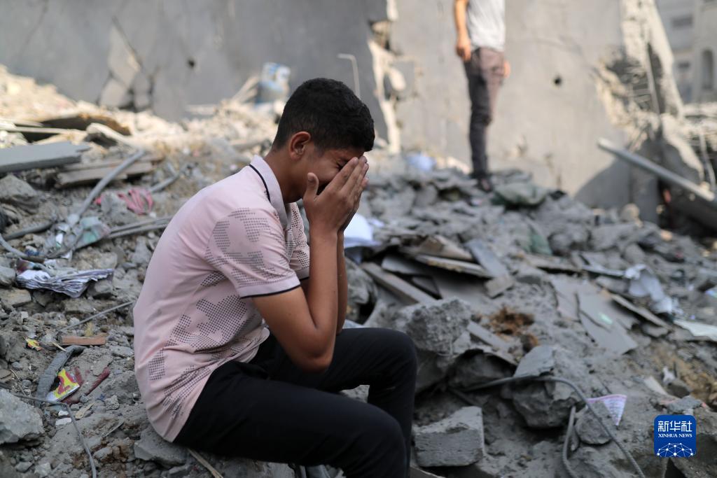11月2日,在加沙地帶中部的布賴(lài)杰難民營(yíng),一名男子坐在以軍空襲后的建筑廢墟上哭泣。新華社發(fā)(亞西爾·庫迪 攝)