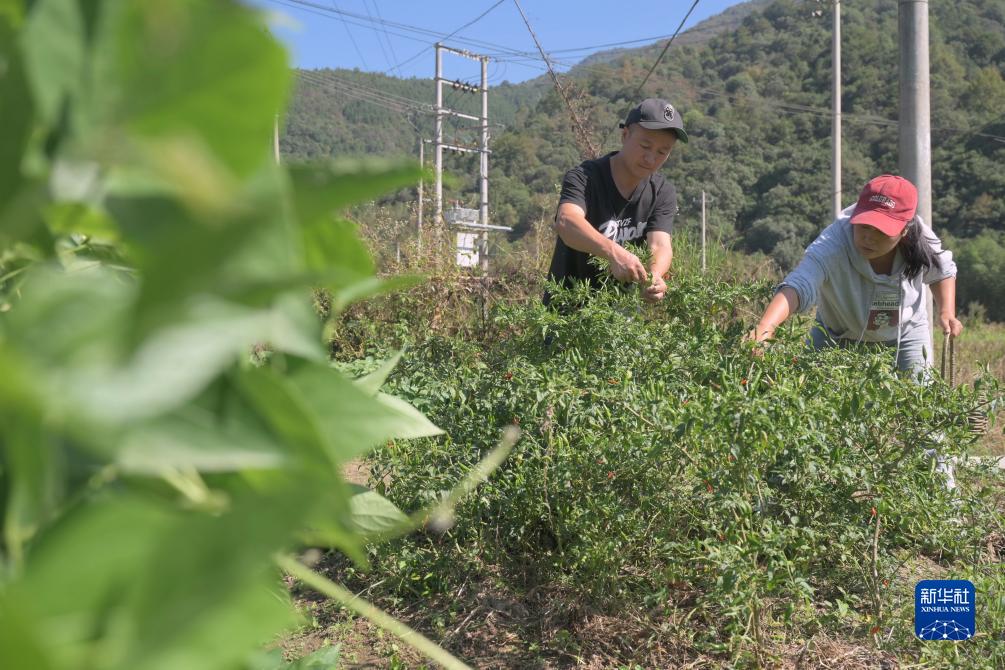 11月1日,李飛(左)和王霖娜在自家菜園采摘紅辣椒。