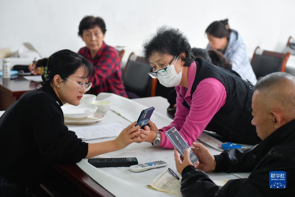 75歲的趙武珍(右二)詢(xún)問(wèn)指導教師劉美琴(左一)如何設置視頻音樂(lè )的淡出效果(10月31日攝)。