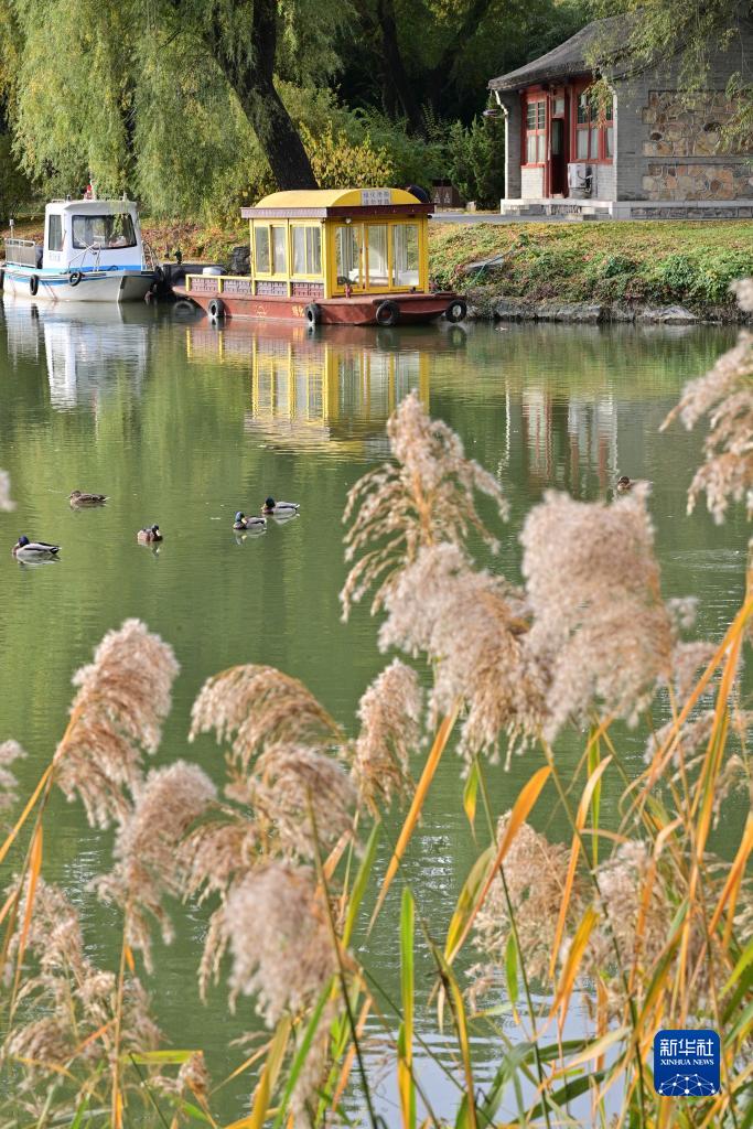 11月3日,在北京頤和園,水鳥(niǎo)在蘆葦邊戲水。