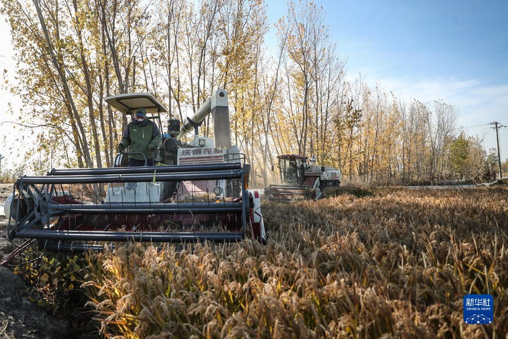 11月3日,農戶(hù)駕駛農業(yè)機械在盤(pán)錦市大洼區王家街道興海村收割水稻。