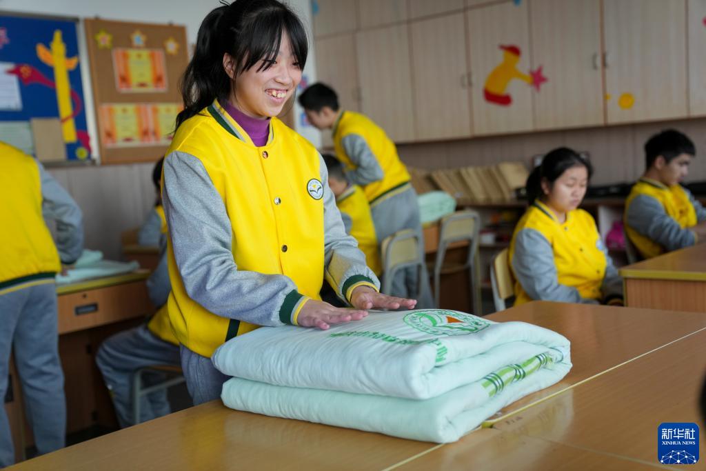 10月30日,在重慶市特殊教育中心的教室內,幾名六年級的視力障礙學(xué)生進(jìn)行疊被子生活技能小比賽。