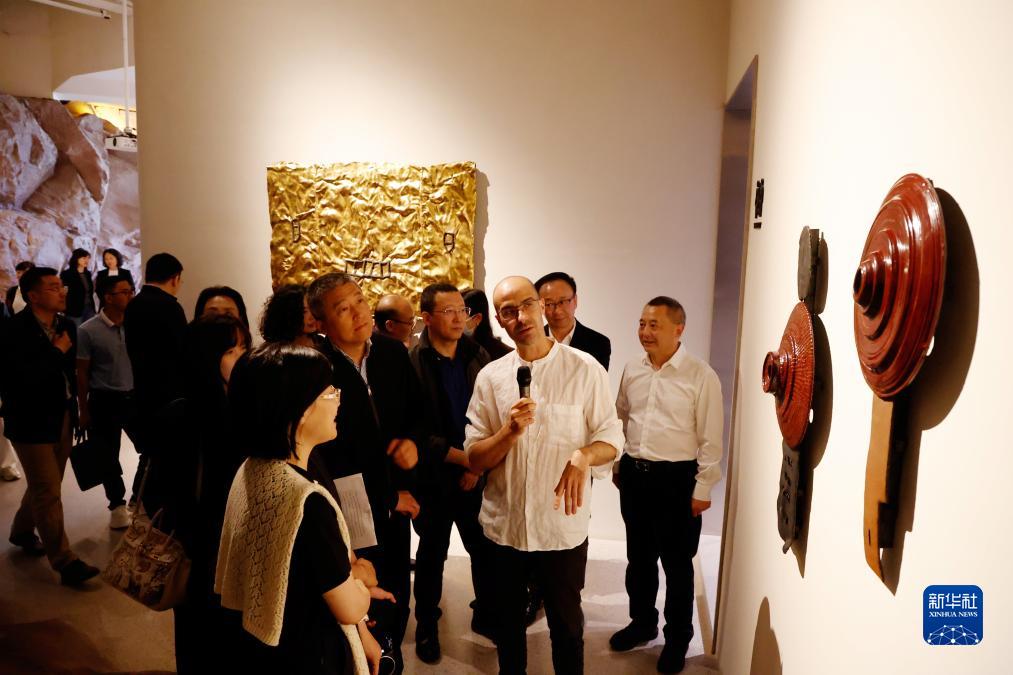 在重慶悅來(lái)美術(shù)館·巖石空間舉辦的“重慶藝術(shù)家檔案——文森·漆”主題展覽上,文森(前右)向觀(guān)眾介紹作品(4月27日攝)。