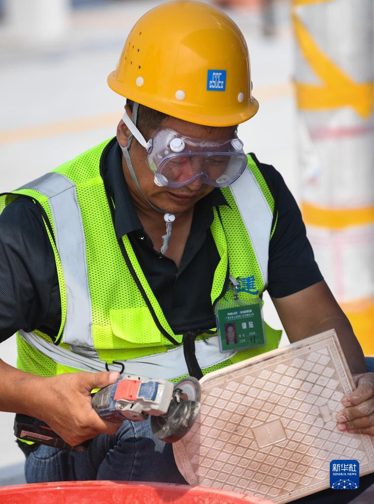 11月3日,參賽選手在鑲貼項目中打磨瓷磚構件。