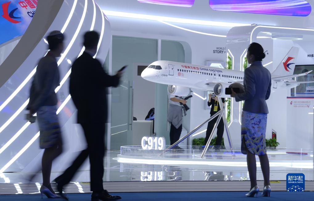 11月3日在中國東方航空公司展臺拍攝的擁有該航司涂裝的國產(chǎn)C919飛機模型。