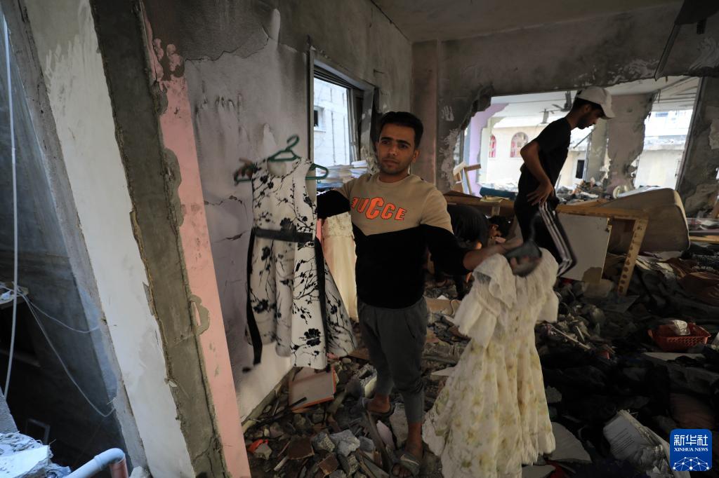 11月3日,在加沙地帶南部城市汗尤尼斯,人們清理遭以色列襲擊后的建筑廢墟。