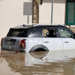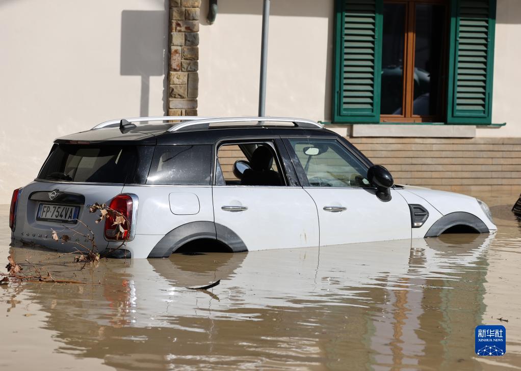11月3日,在意大利托斯卡納大區比森齊奧營(yíng),一輛汽車(chē)浸泡在洪水中。