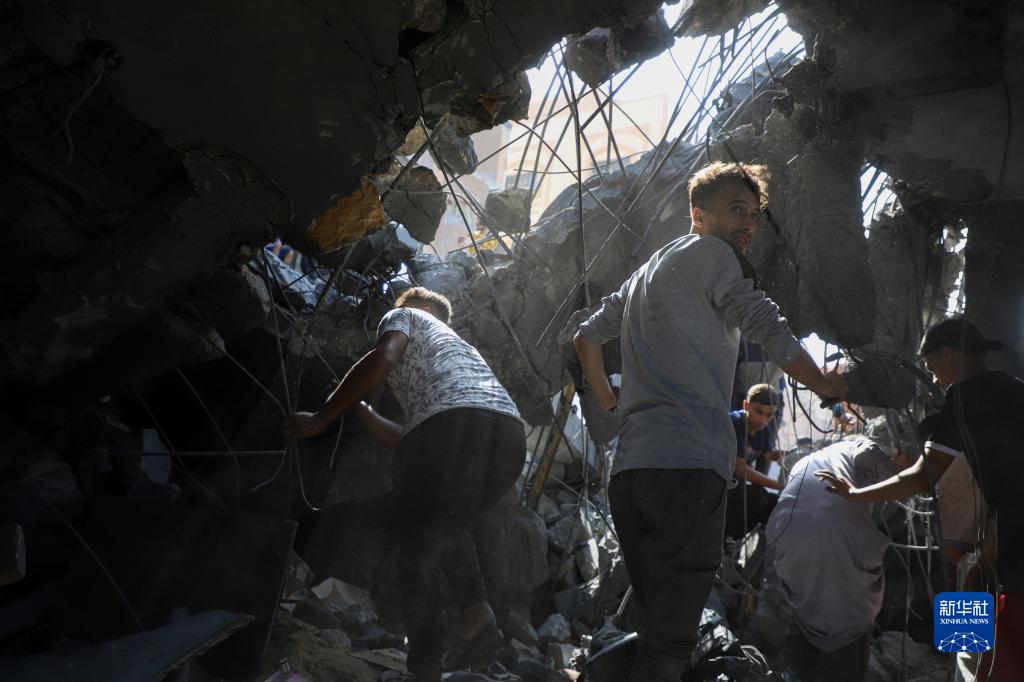11月3日,在加沙地帶南部城市汗尤尼斯,人們在遭襲擊后的建筑廢墟上實(shí)施救援。