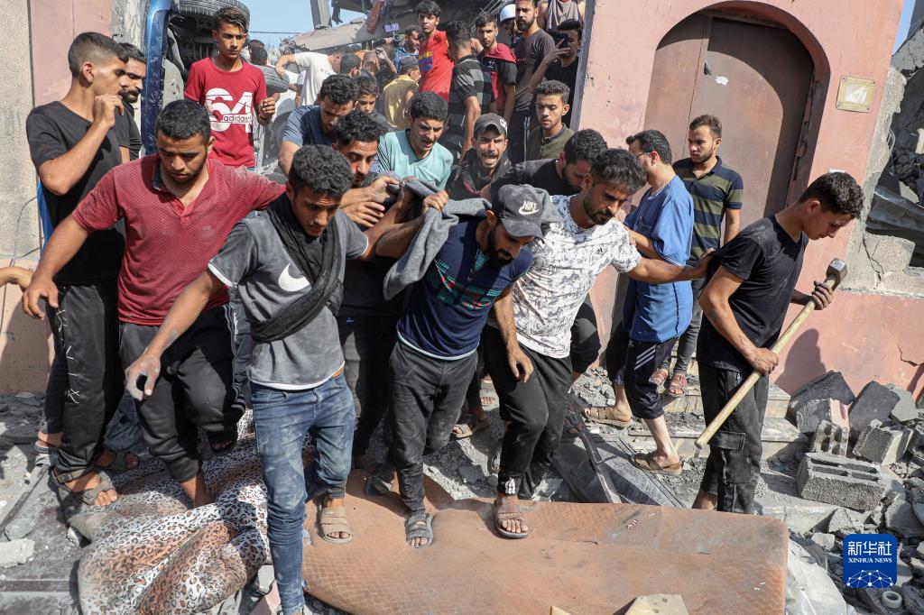 11月3日,在加沙地帶南部城市汗尤尼斯,人們在遭襲擊后的建筑廢墟上實(shí)施救援。