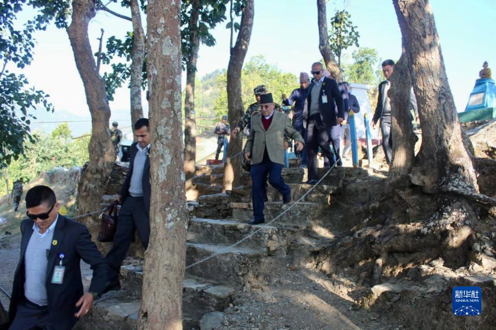 11月4日,在尼泊爾西部扎澤爾果德,尼泊爾總理普拉昌達(中)抵達災區。