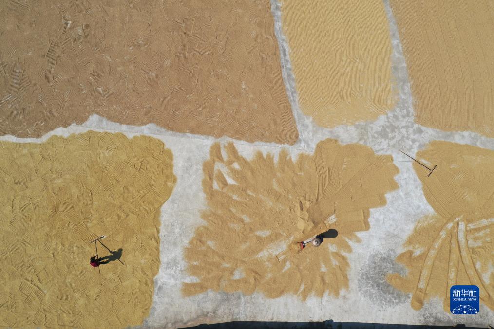 11月2日,湖南省永州市道縣梅花鎮斯屋村,村民在翻曬稻谷(無(wú)人機照片)。