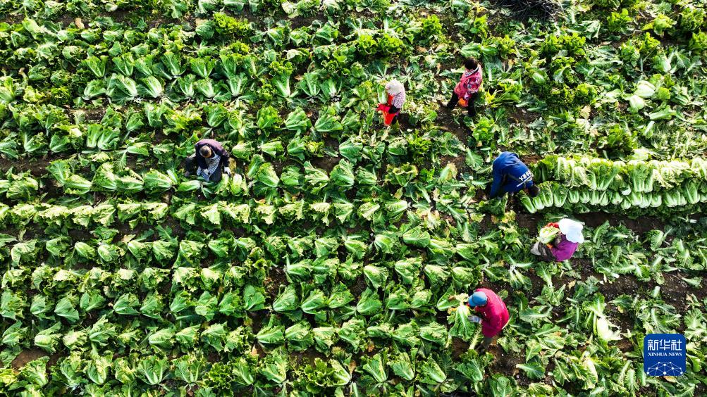 11月4日,河北省玉田縣玉田鎮農民在田間收獲白菜(無(wú)人機照片)。