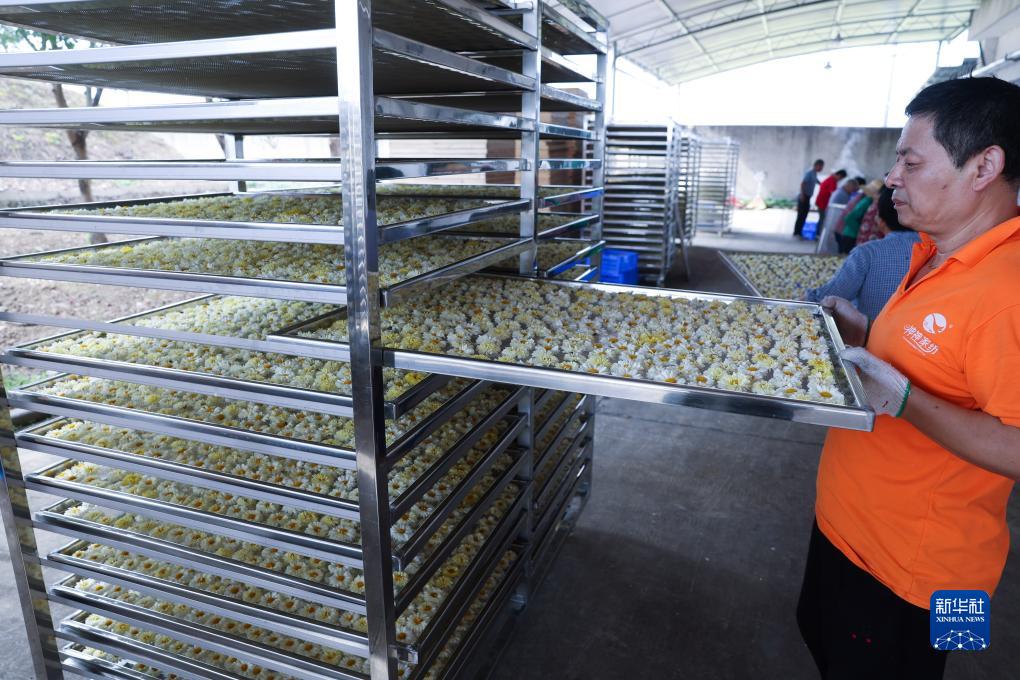 11月4日,在三村村一家現代農業(yè)企業(yè)內,工作人員把分揀好的杭白菊送入車(chē)間進(jìn)行進(jìn)一步加工。