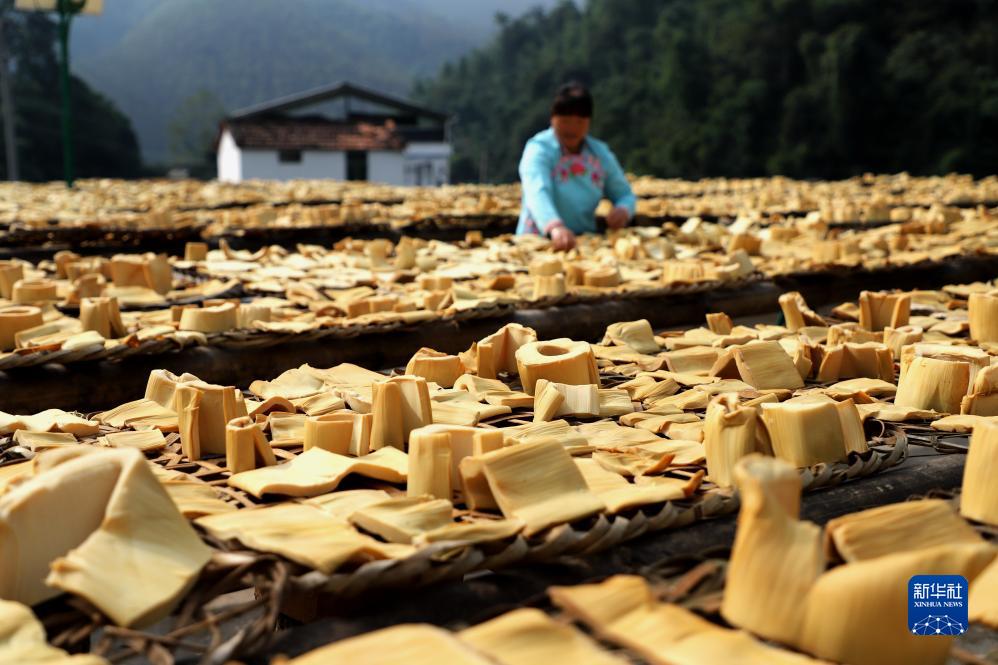 11月3日,在廣西田林縣六隆鎮平細村,村民在曬八渡筍。