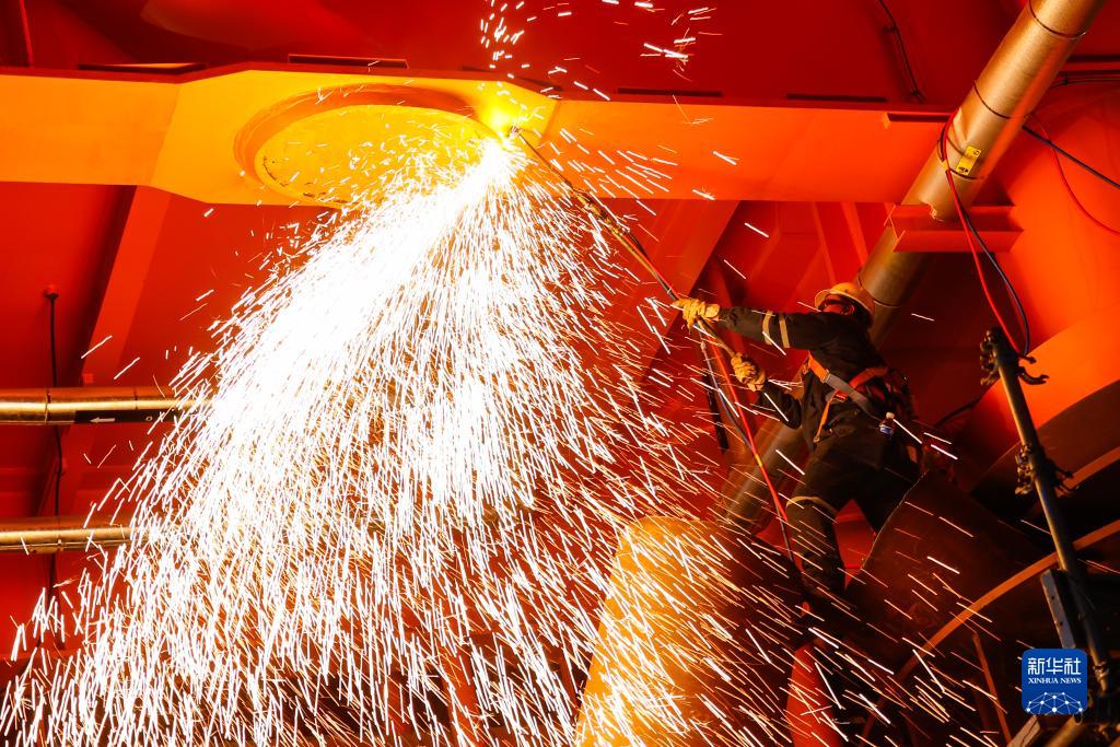 11月4日,工人在埕北油田中心平臺作業(yè)現場(chǎng)進(jìn)行切割作業(yè)。