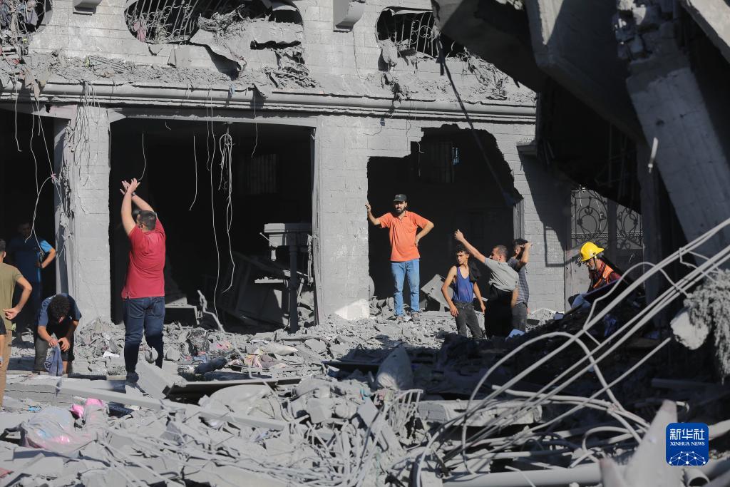 11月4日,在加沙城,人們查看遭以色列襲擊后的建筑廢墟。