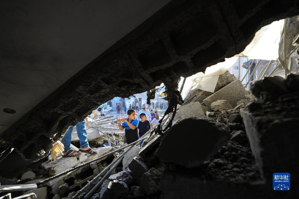 11月4日,在加沙地帶南部城市汗尤尼斯,人們在遭以色列襲擊后的建筑廢墟中實(shí)施救援。