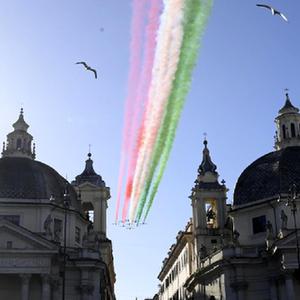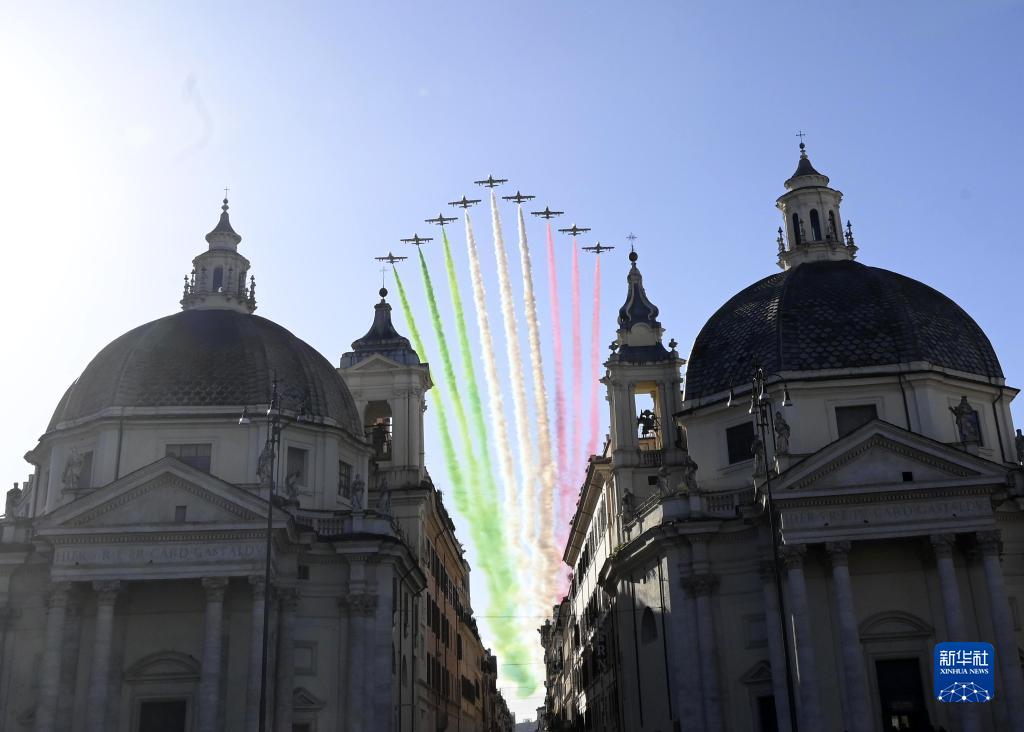 11月4日,意大利“三色箭”飛行表演隊噴出象征國旗三色的煙霧飛過(guò)羅馬上空,慶祝國家團結日。
