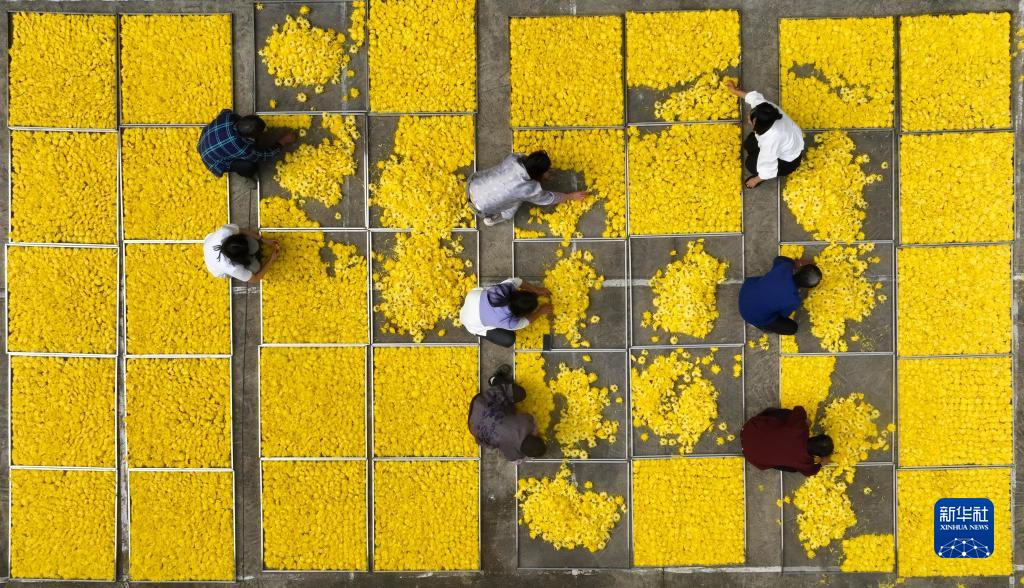 11月4日,在岳林村皇菊種植基地,村民在整理攤鋪菊花(無(wú)人機照片)。