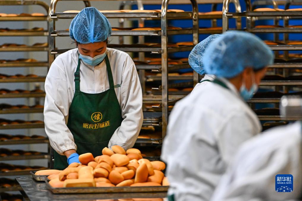 工作人員在新疆喀什綜合保稅區內的新疆疆來(lái)美農業(yè)科技有限公司分揀剛做好的糕點(diǎn)(11月4日攝)。