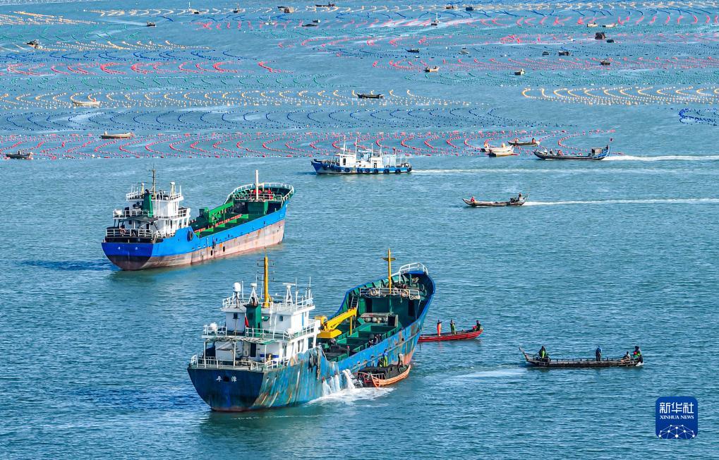 11月4日,在榮成市愛(ài)倫灣海域鮑魚(yú)養殖區,養殖戶(hù)將鮑魚(yú)裝船(無(wú)人機照片)。