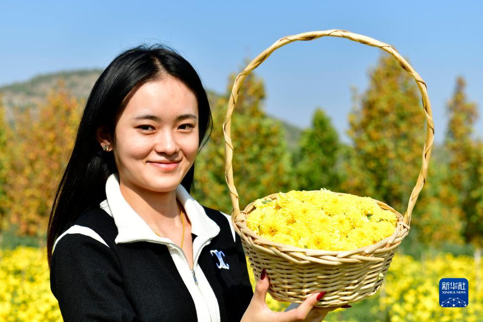 11月4日,在嘉祥縣紙坊鎮有機菊花種植基地,工作人員展示采摘的菊花。