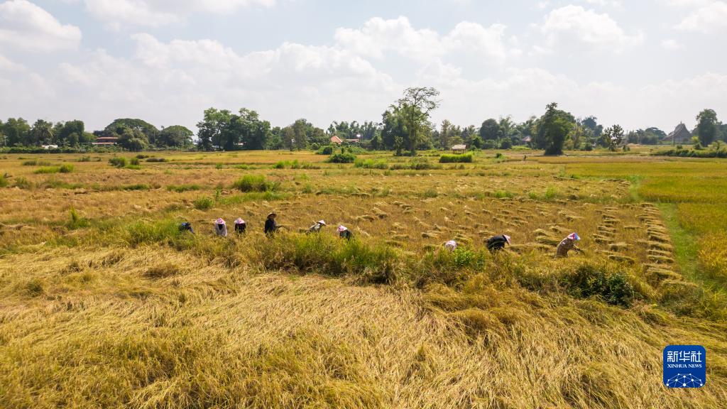 11月4日,農民在老撾首都萬(wàn)象一處田地里勞作(無(wú)人機照片)。