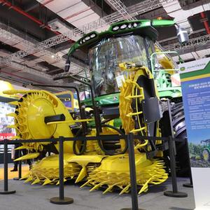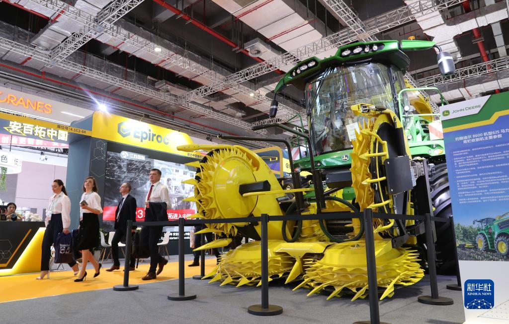 11月5日,參觀(guān)者在第六屆進(jìn)博會(huì )上經(jīng)過(guò)約翰迪爾公司推出的8600機型青貯收割機展品。