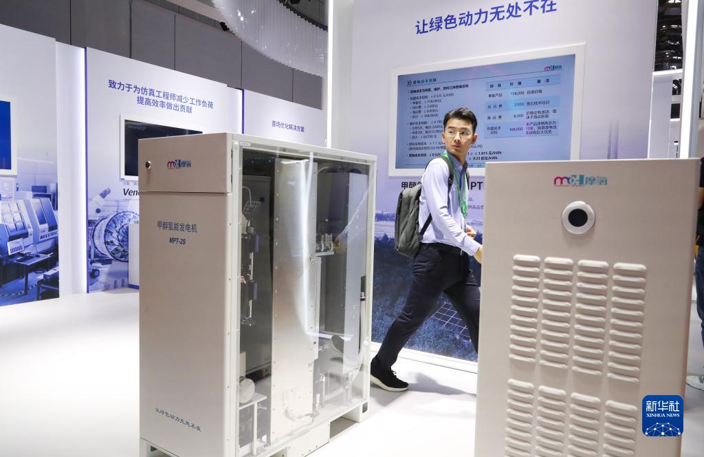 11月5日,參觀(guān)者從第六屆進(jìn)博會(huì )東芝公司展出的甲醇氫能發(fā)電機展品旁走過(guò)。