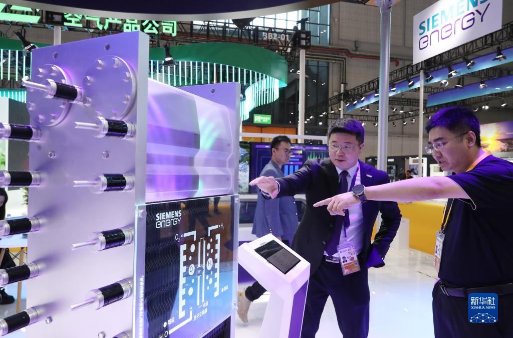 11月5日,工作人員(左)介紹第六屆進(jìn)博會(huì )西門(mén)子公司展出的電解水制氫裝置模型。
