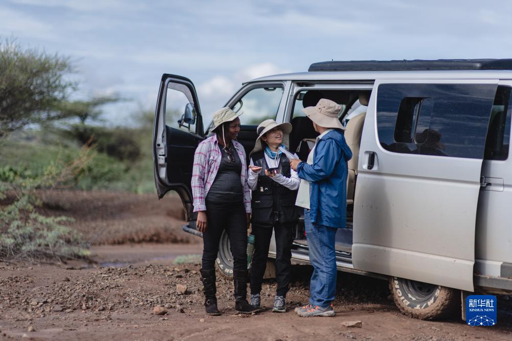 11月4日,中肯聯(lián)合考古隊隊員彭勝藍(中)和顧雪軍(右)在位于肯尼亞巴林戈郡馬里加特鎮的考古現場(chǎng)與肯方隊員交流發(fā)掘出的石器。