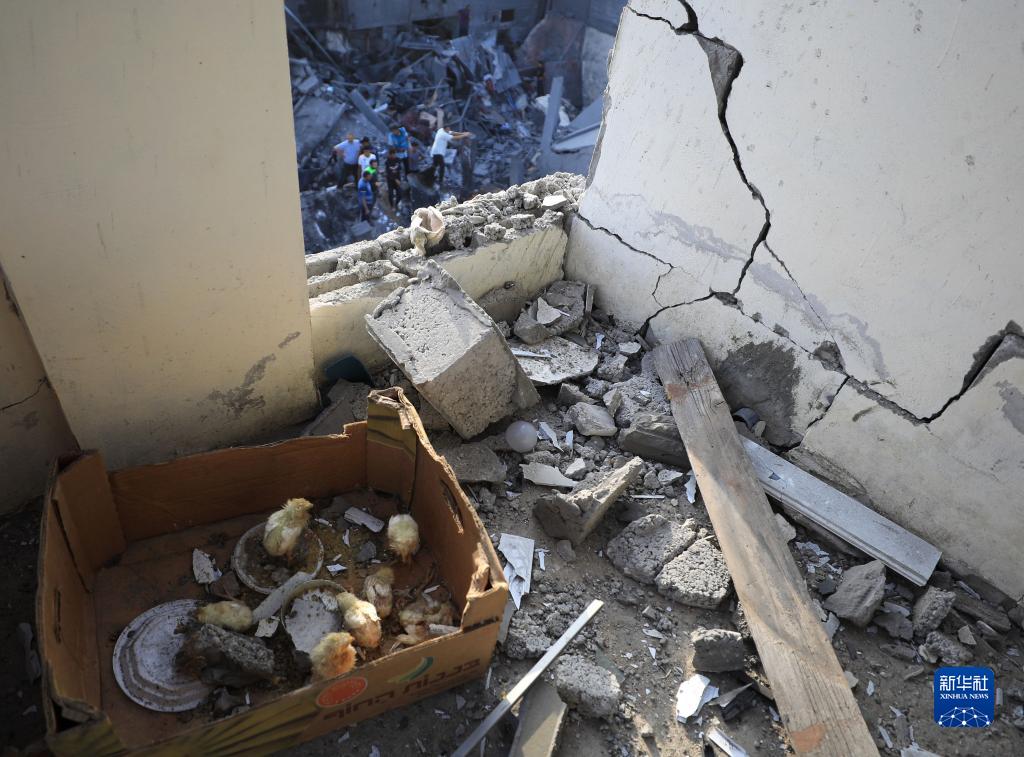 11月5日,在加沙地帶中部的代爾拜拉赫,遭以色列轟炸后的邁加齊難民營(yíng)建筑物被損毀。
