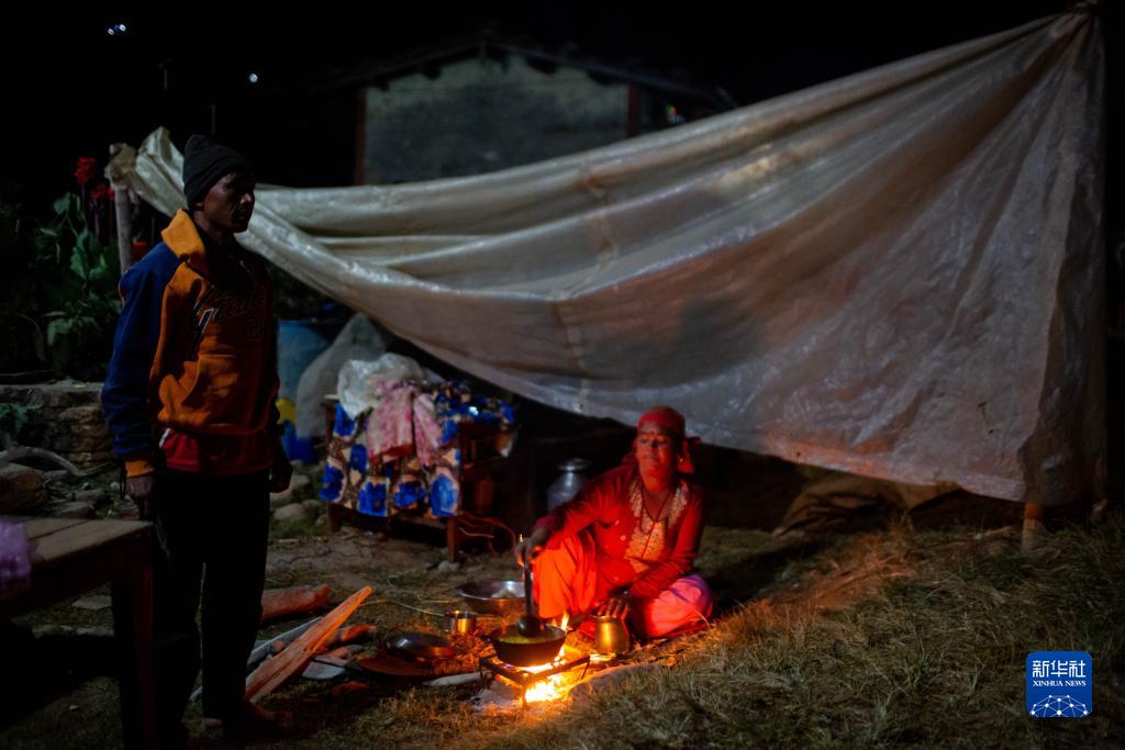 11月5日,一名女子在尼泊爾西部扎澤爾果德地震災區的應急帳篷外做飯。