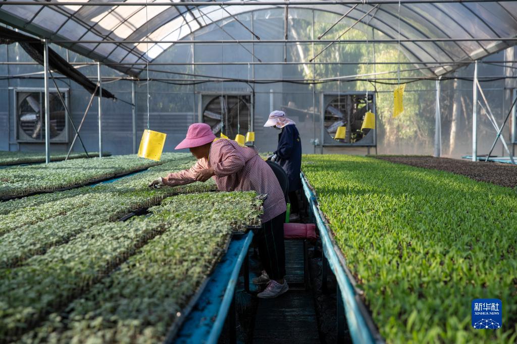 工人在云南元謀現代種業(yè)科技園育苗工廠(chǎng)大棚內進(jìn)行育苗工作(11月5日攝)。