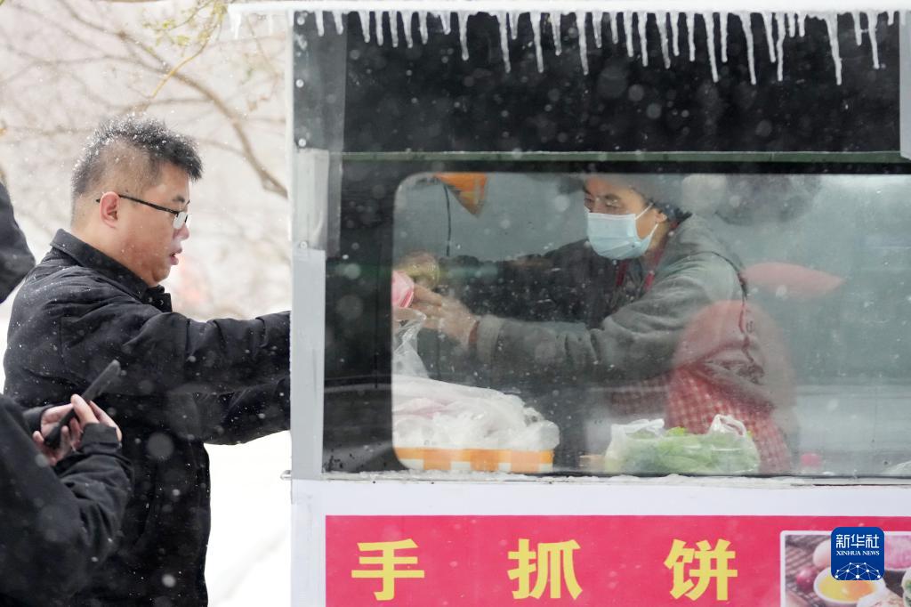11月6日,哈爾濱市民在風(fēng)雪中買(mǎi)早餐。