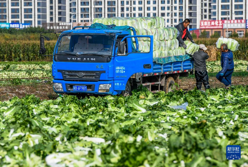 11月6日,河北省玉田縣虹橋鎮農民在裝車(chē)外運白菜。