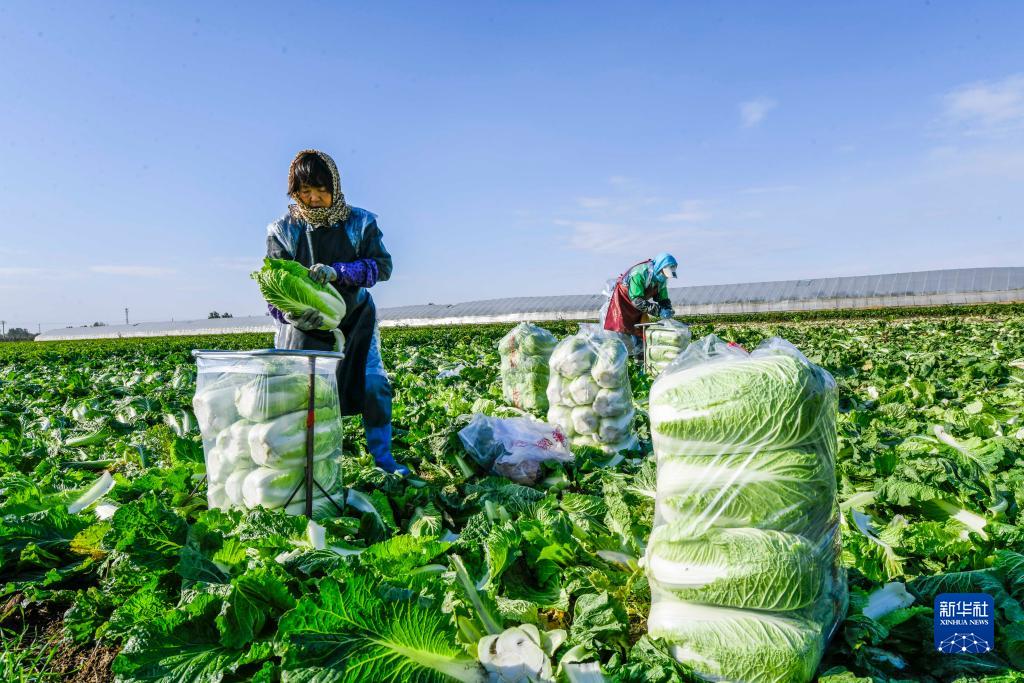 11月6日,河北省玉田縣虹橋鎮農民在收獲包裝白菜。
