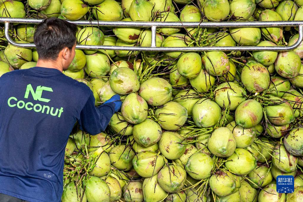 11月3日,工人在泰國叻武里府丹嫩沙多的椰子工廠(chǎng)卸貨。