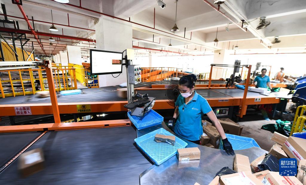 11月6日,在中國郵政集團有限公司??卩]區中心,工作人員在分揀包裹。